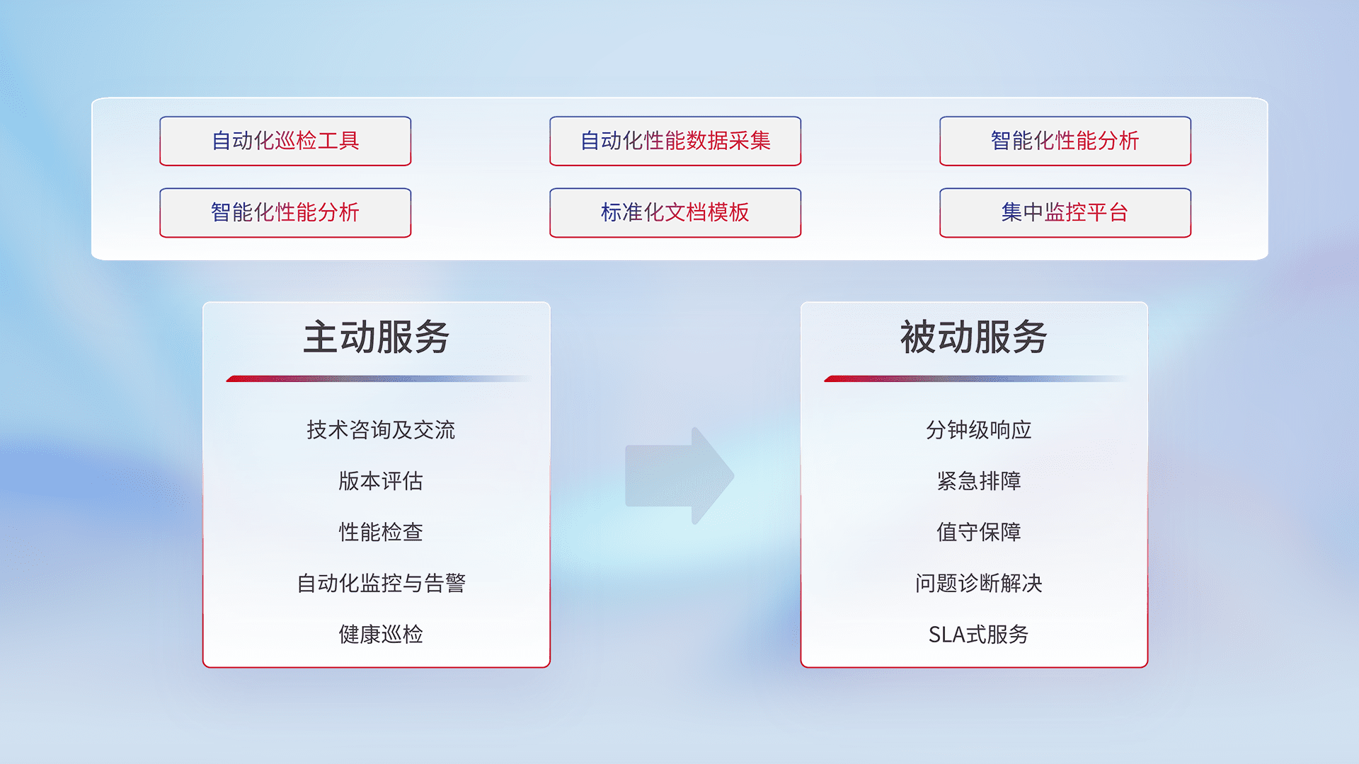 智能化工具和标准化文档,,,,保障服务质量,,提供主动服务(包含技术咨询、、版本评估、、、性能检查、、、、自动化监控与告警、、健康巡检)和被动服务包含(分钟级响应、、、紧急排障、、、值守保障、、问题诊断解决、、SLA服务)。。。。